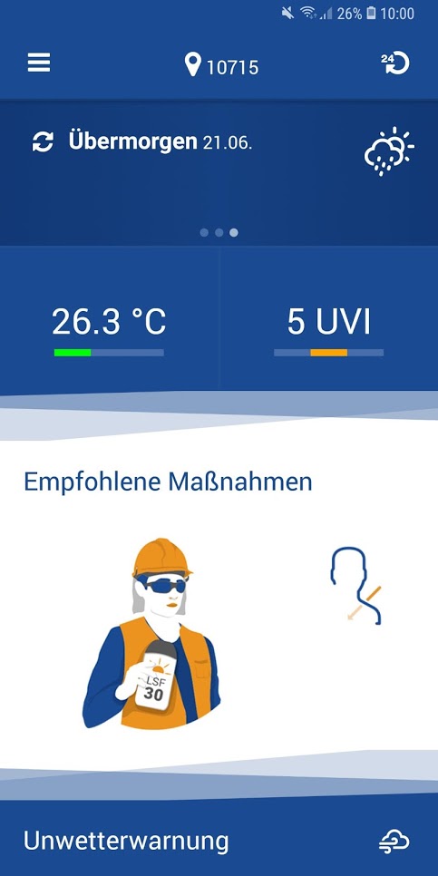 Diese App empfiehlt Ihnen passende Schutz-Maßnahmen zu wetterbedingten gesundheitlichen Gefährdungen. Bauwetter ist für alle, die in der Bauwirtschaft und in baunahen Dienstleistungen arbeiten, die viel draußen sind und sich gesundheitlich vor Wettereinflüssen schützen müssen. Wählen Sie Ihren aktuellen Standort oder gewünschten Ort aus. Auf Basis der Wetterdaten werden dann die gefühlte Temperatur – nicht die physikalische Temperatur- und die notwendigen Arbeitsschutzmaßnahmen angezeigt. Eine Balkenskala mit den Ampelfarben Rot, Gelb und Grün zeigt Ihnen, ob besondere Schutzmaßnahmen erforderlich sind. Sie können auch auf ausführliche Informationen und auf die Detailansicht für den ganzen Tag umschalten. Bauwetter warnt ebenso bei Extremwetterlagen. Mit Bauwetter können Sie sich auf das Wetter vorbereiten, damit Sie auch auf lange Sicht gesund bleiben, trotz UV-Strahlung oder Kälte.